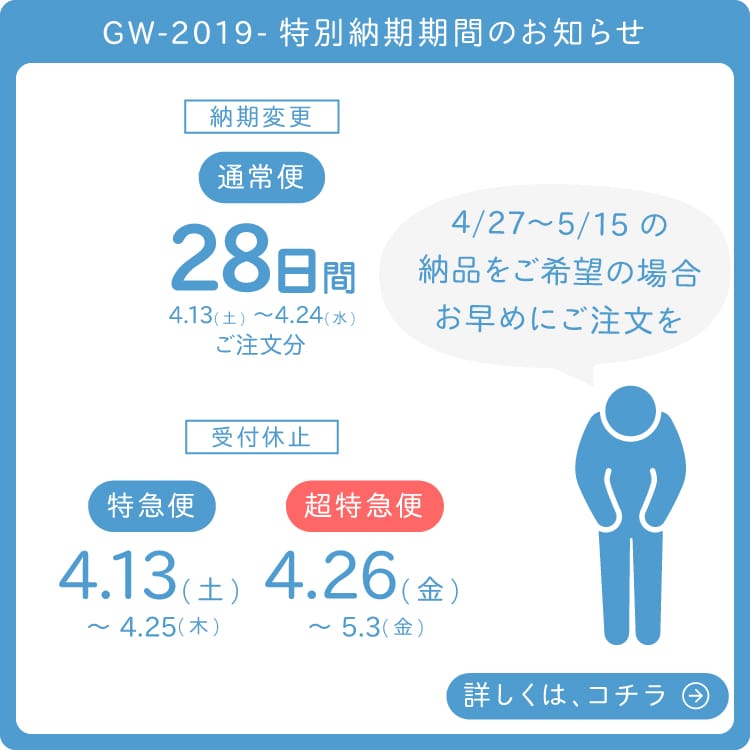 誠に恐縮ながら、4/27〜5/15頃の納品をご希望のお客様は、お早めのご注文をご検討ください。